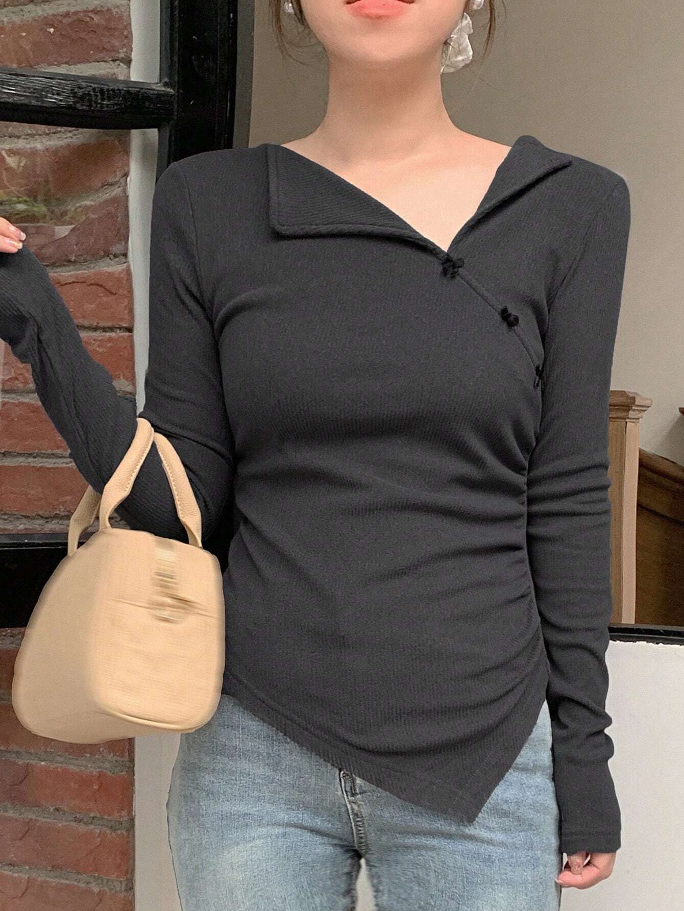 Details: Asymmetrical, Button, Rib-Knit