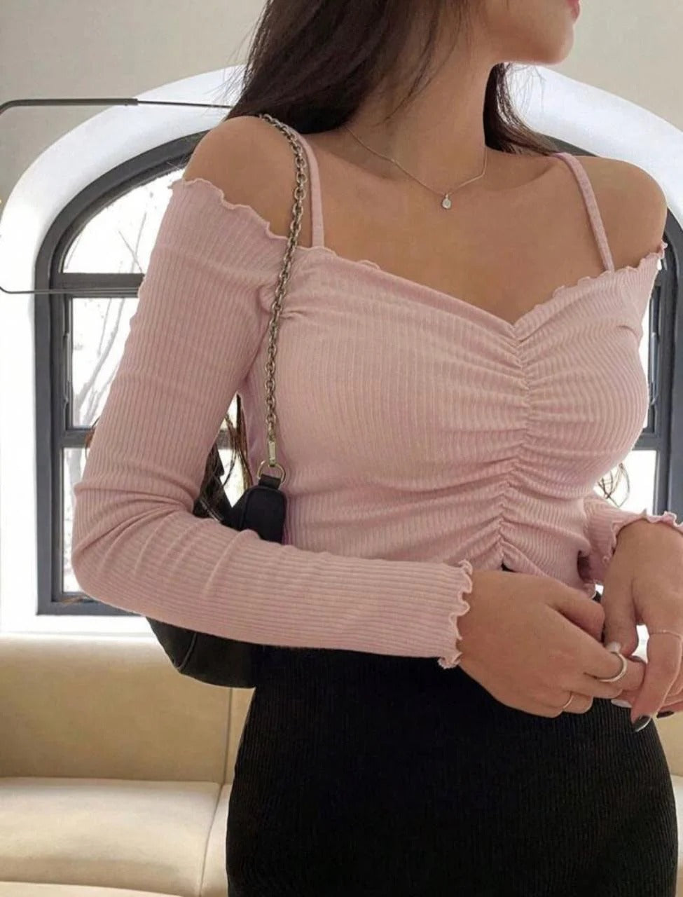 COLD SHOULDER RUCHED FRONT LETTUCE TRIM TEE
