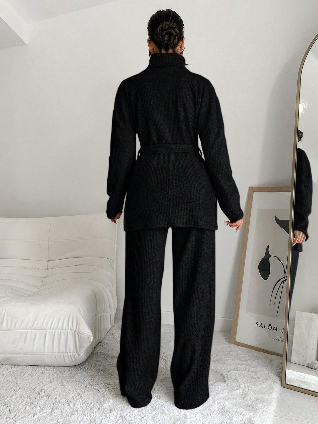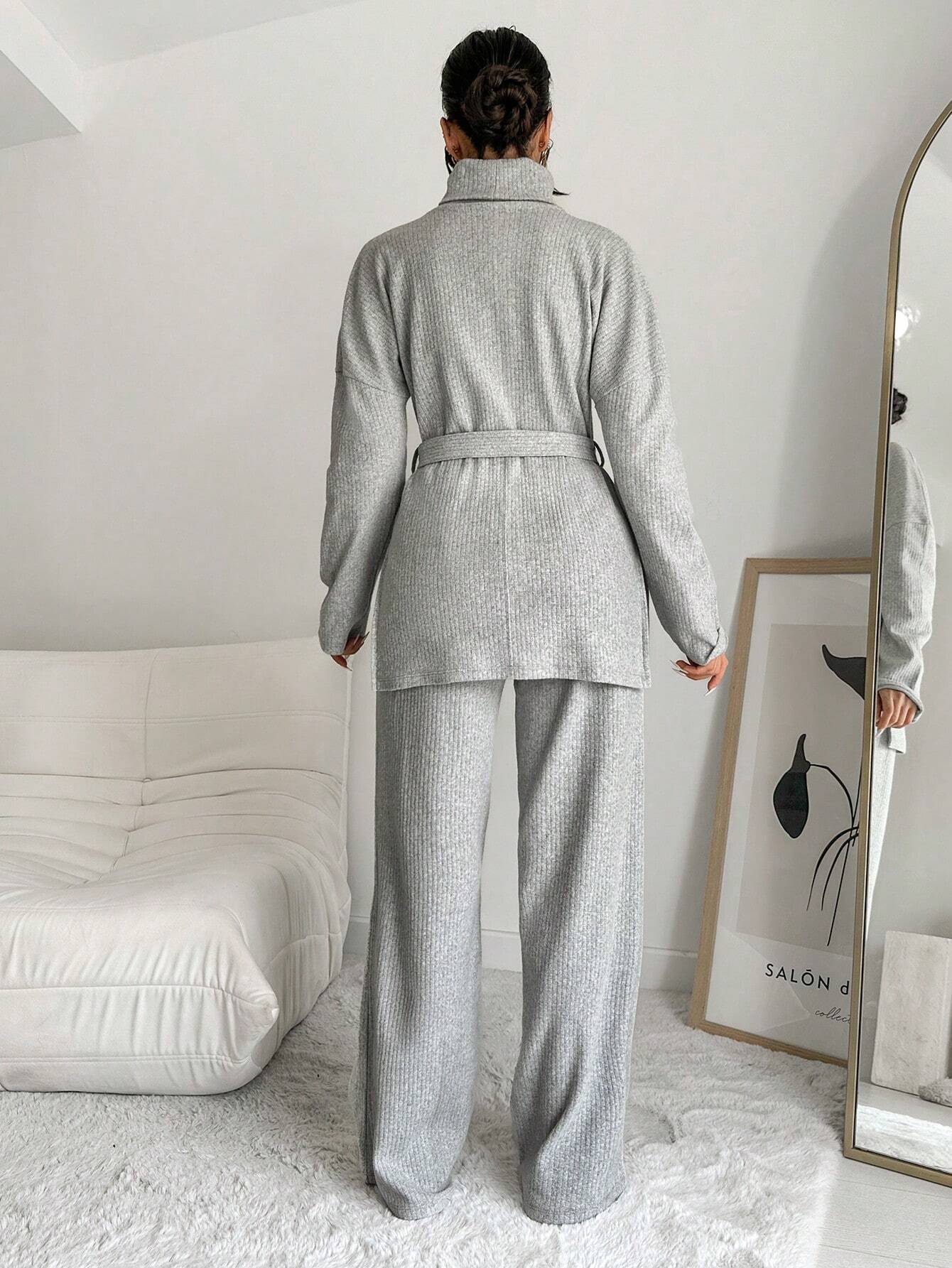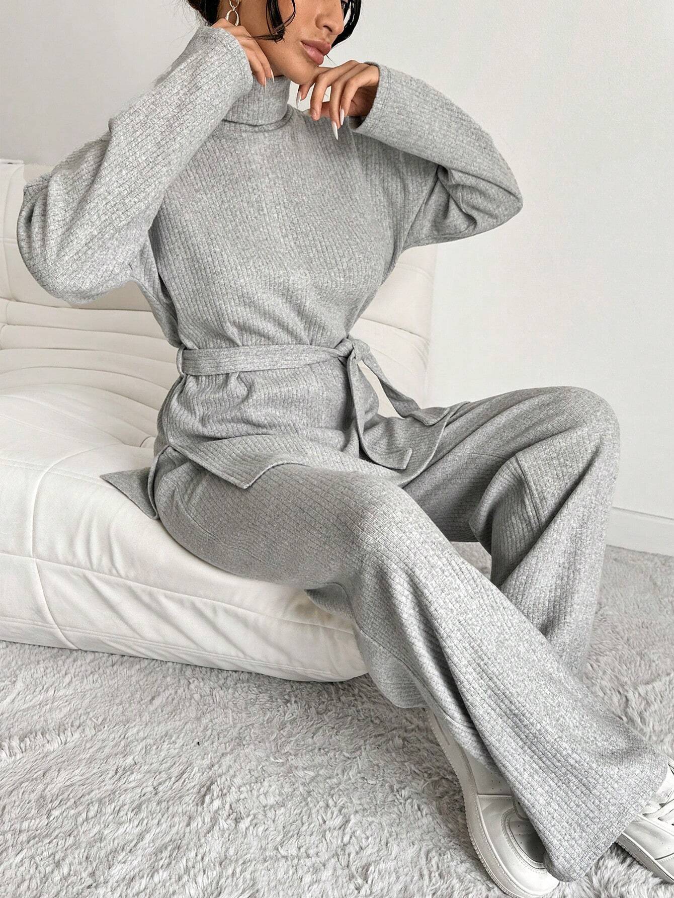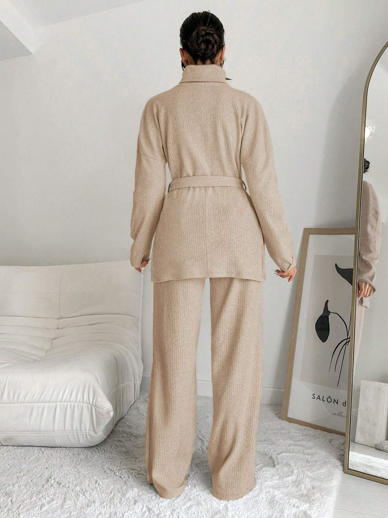 COTTNLINE SOLID COLOR HIGH NECK LEISURE KNITTED SWEATER 2PCS/SET