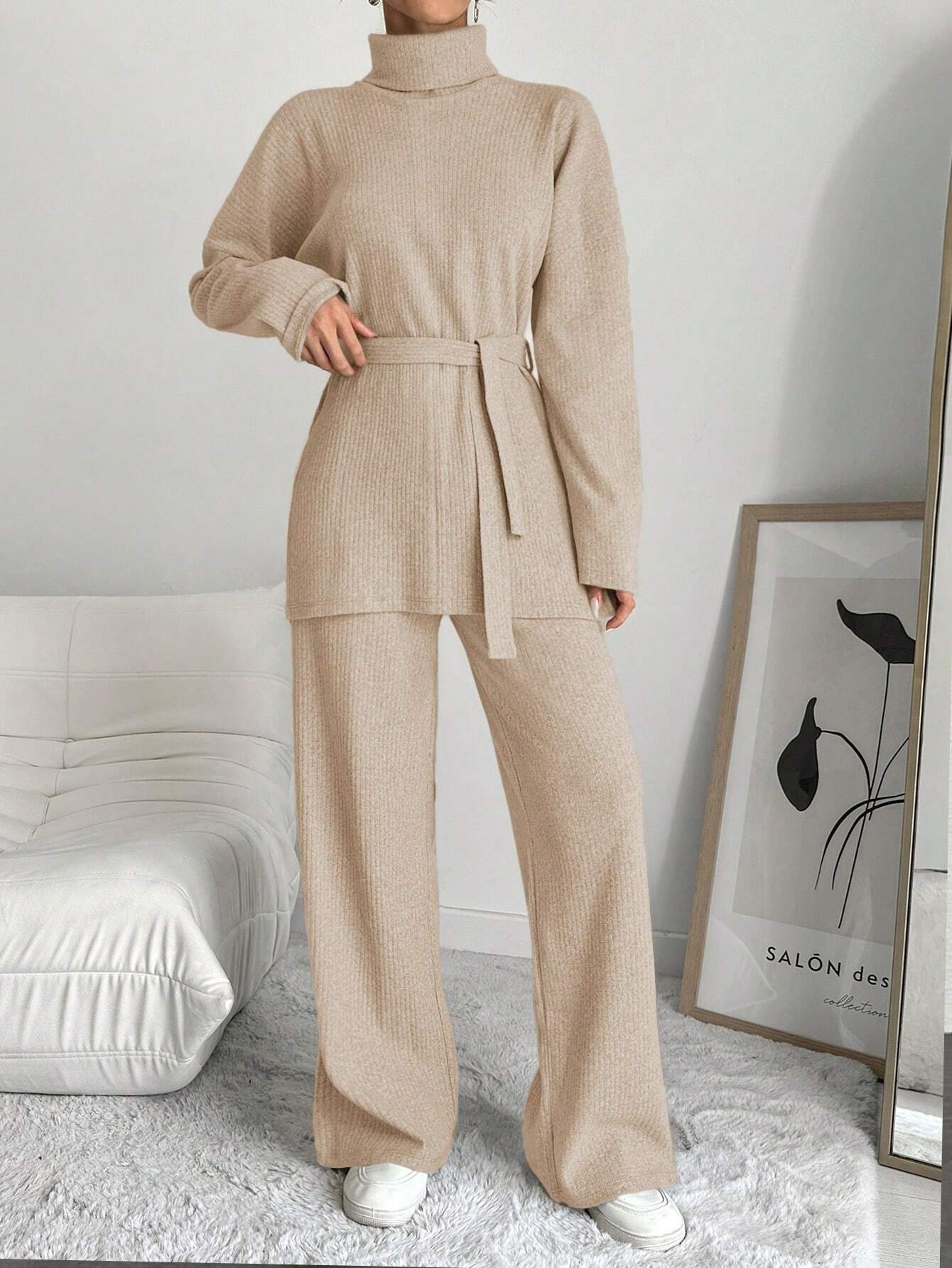 COTTNLINE SOLID COLOR HIGH NECK LEISURE KNITTED SWEATER 2PCS/SET