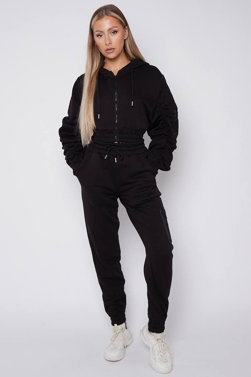 • Featuring a boxy fit cropped ruched hoodie with pocket details cuffed joggers and elastic in hem and cuff & cotton draw cord with tipping