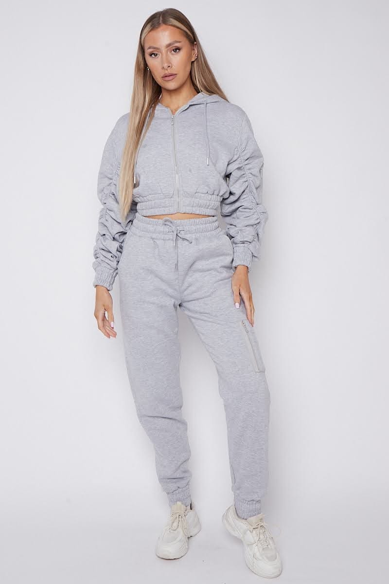 • Featuring a boxy fit cropped ruched hoodie with pocket details cuffed joggers and elastic in hem and cuff & cotton draw cord with tipping