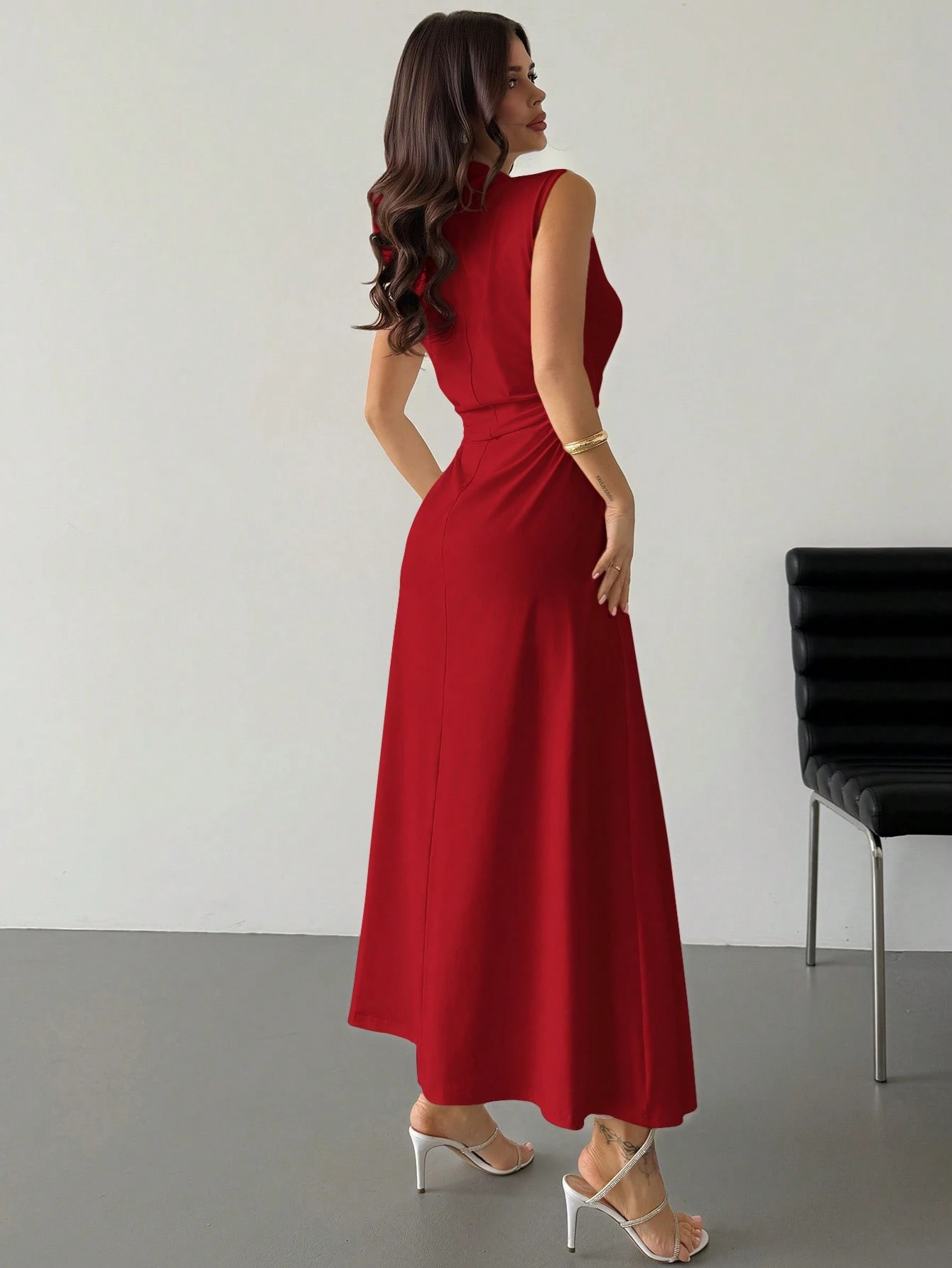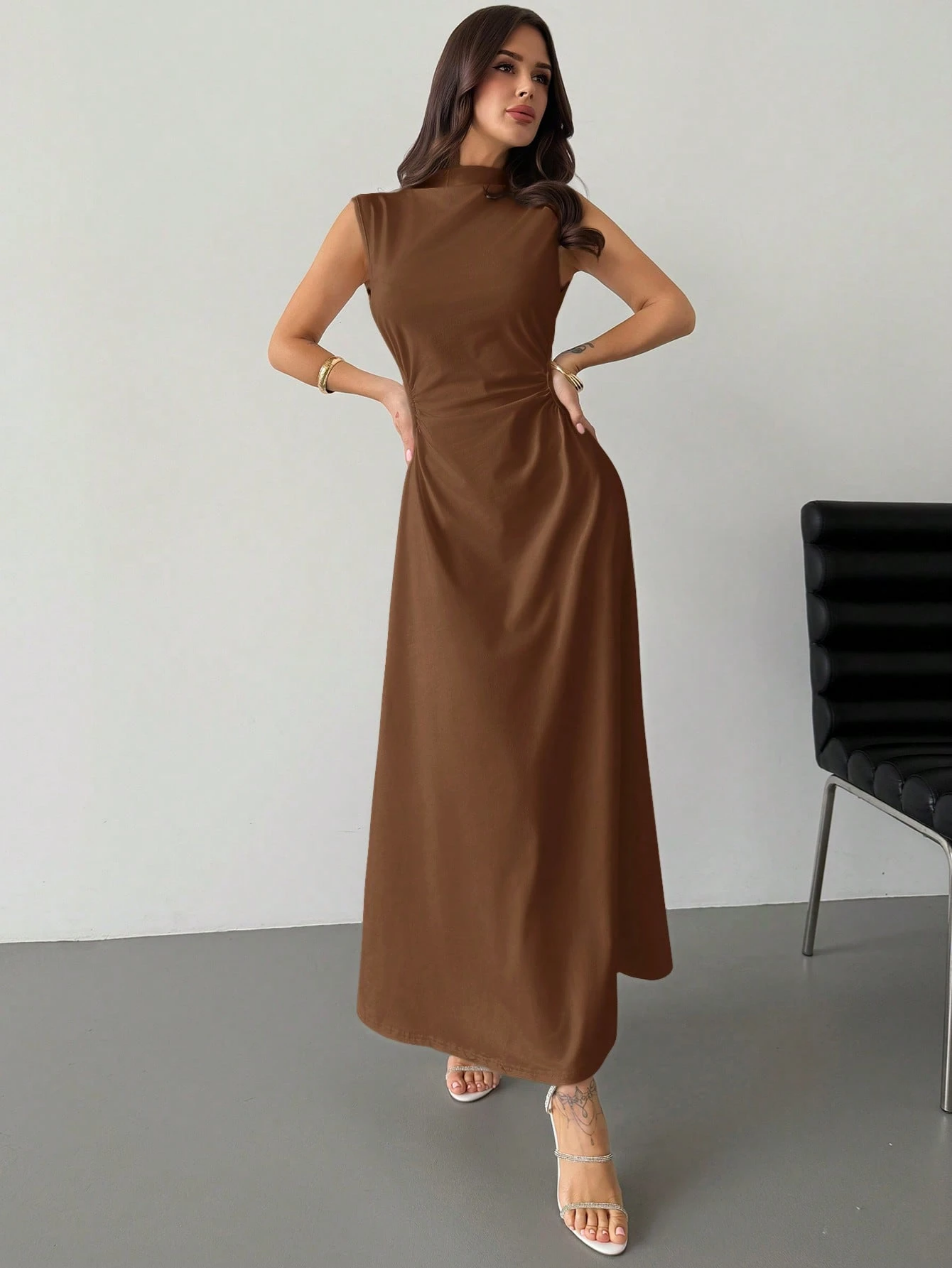 ELEGANT RUCHED STAND COLLAR SLEEVELESS A-LINE MAXI DRESS