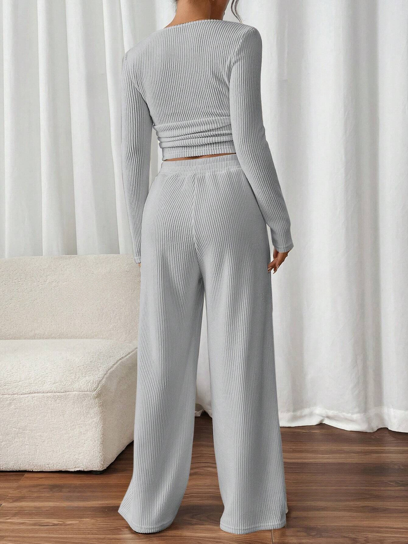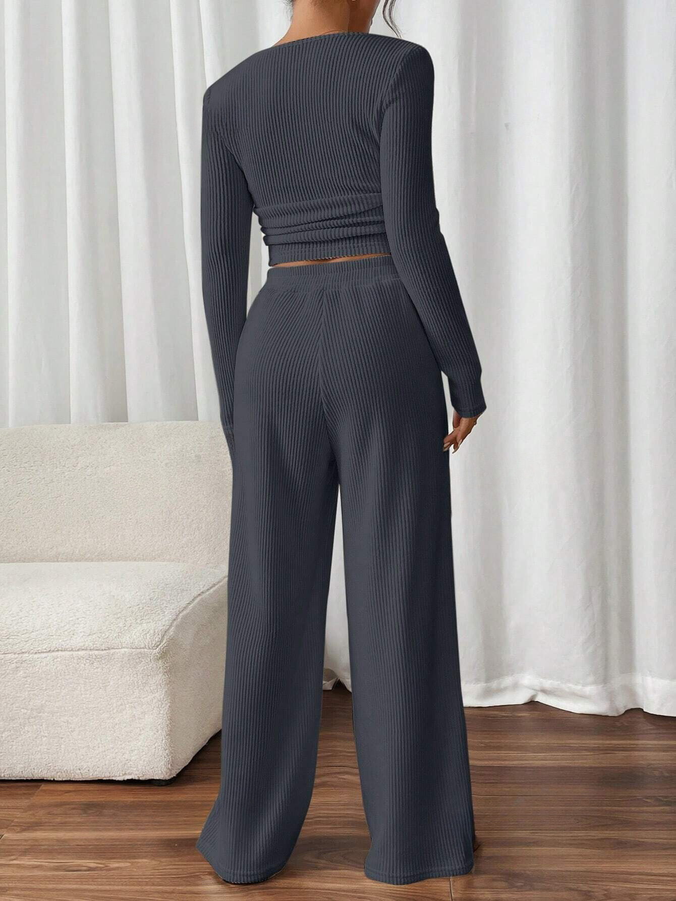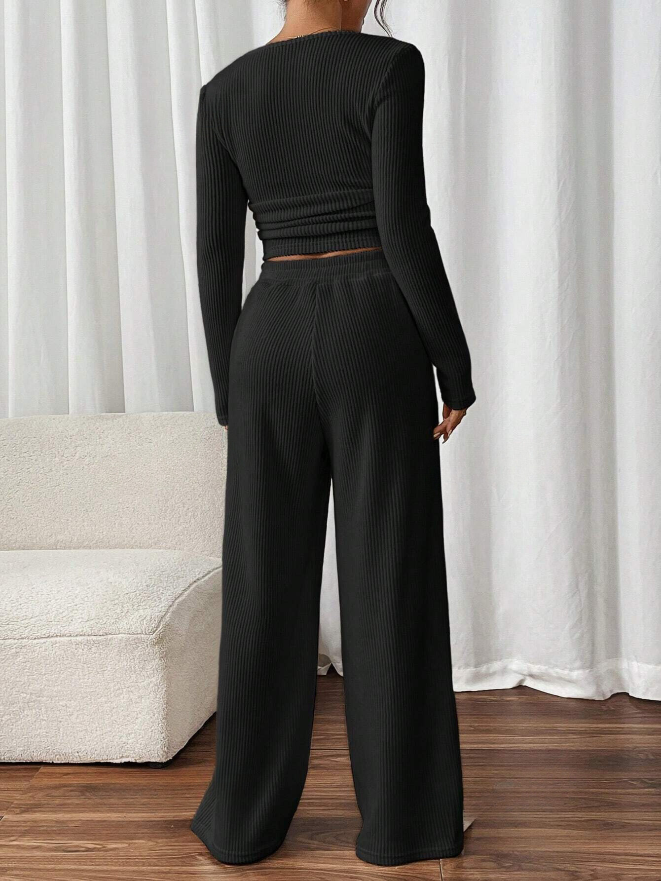 FRENCHY 2PCS/SET WOMEN SOLID COLOR SQUARE NECK LONG SLEEVE RIBBED TOP AND PANTS