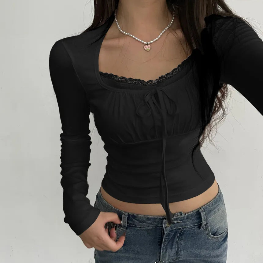 This long-sleeve square neckline crop top can be styled for any occasion. It features a ruched bust area and delicate lace trim for femme vibes. Pair it with classic denim jeans for an effortlessly chic ensemble.