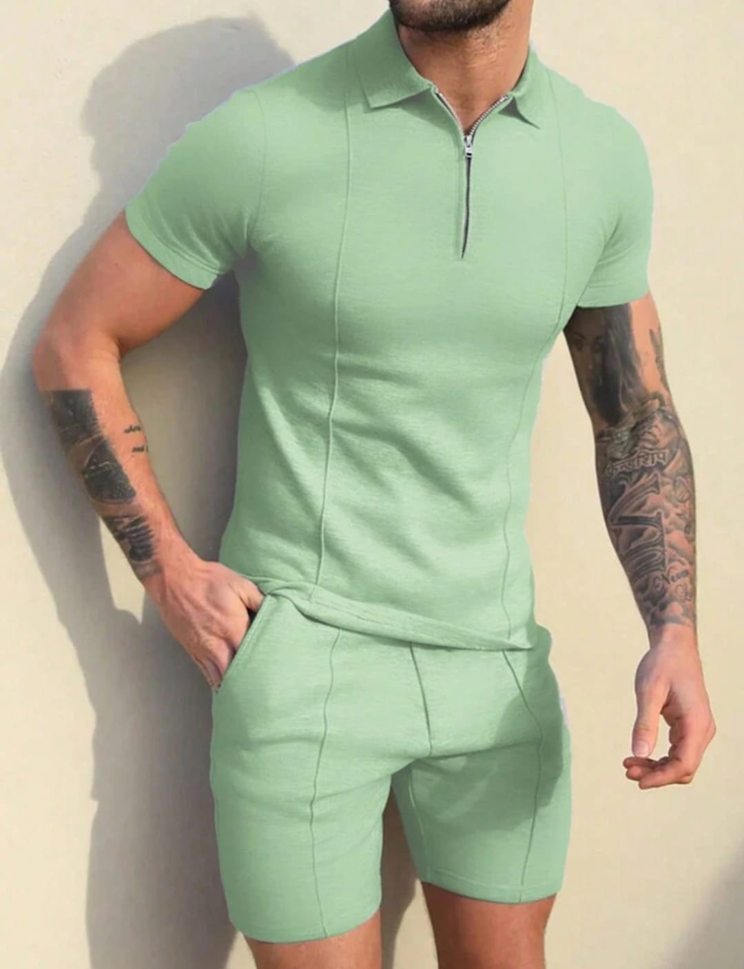 MEN SOLID COLOR TURN-DOWN COLLAR CASUAL SHORT SLEEVE T-SHIRT AND DRAWSTRING SHORTS SET