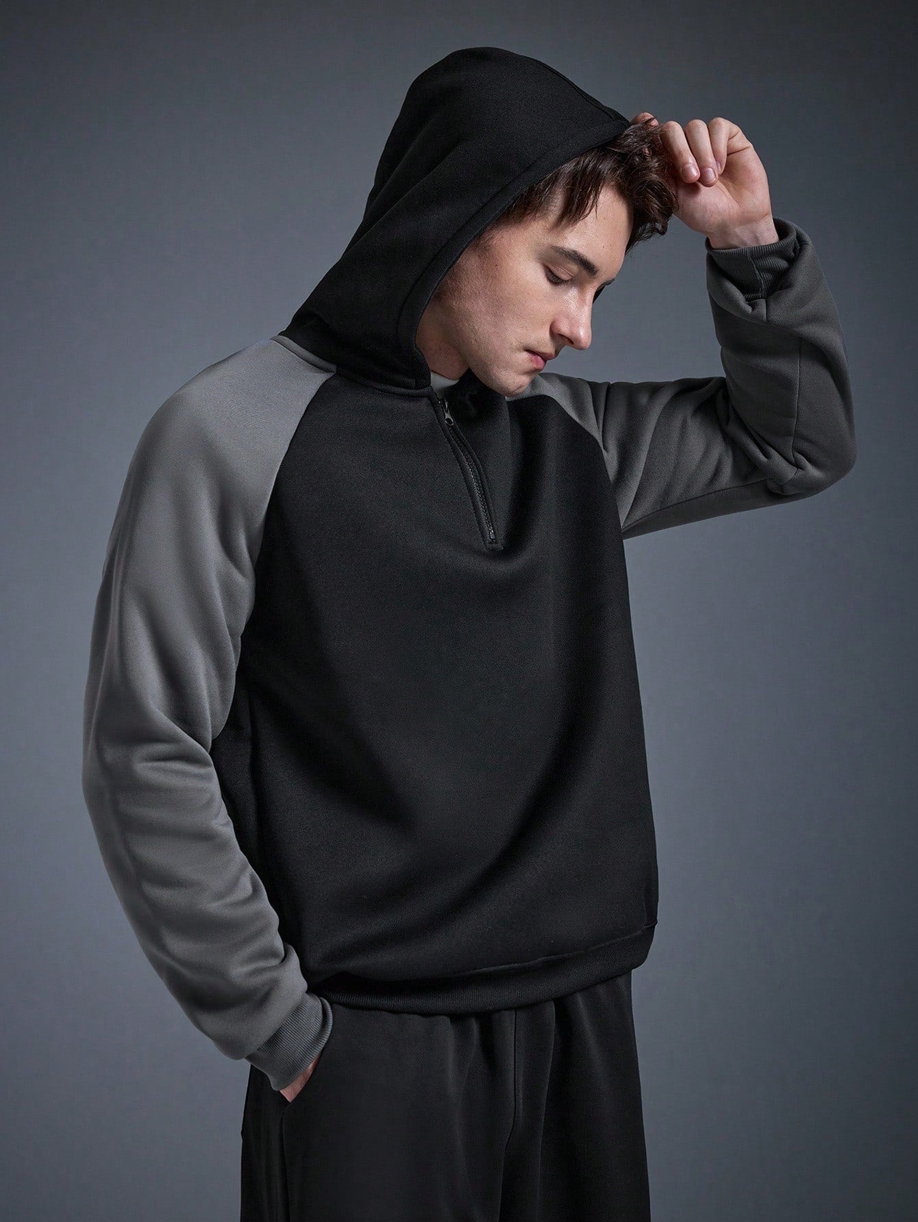 MEN'S FASHION COLOR BLOCK RAGLAN SLEEVE STRIPED HALF-ZIP HOODIE