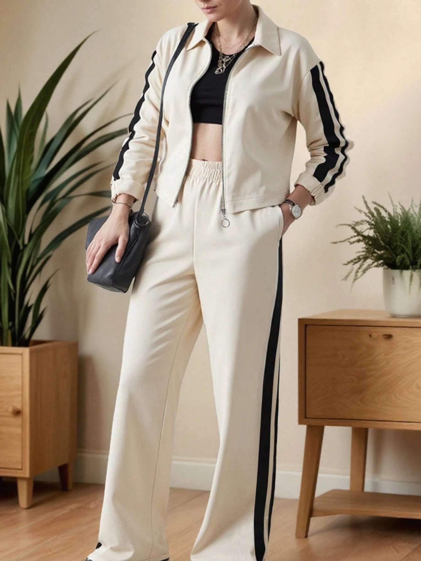 STRIPED ZIP-UP JACKET & HIGH WAIST COMFORTABLE WIDE LEG PANTS