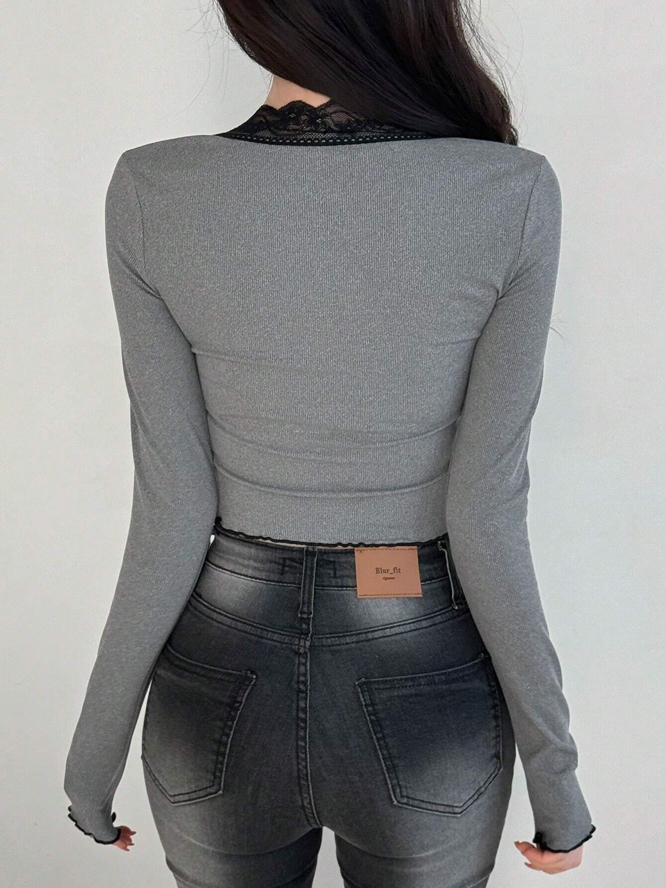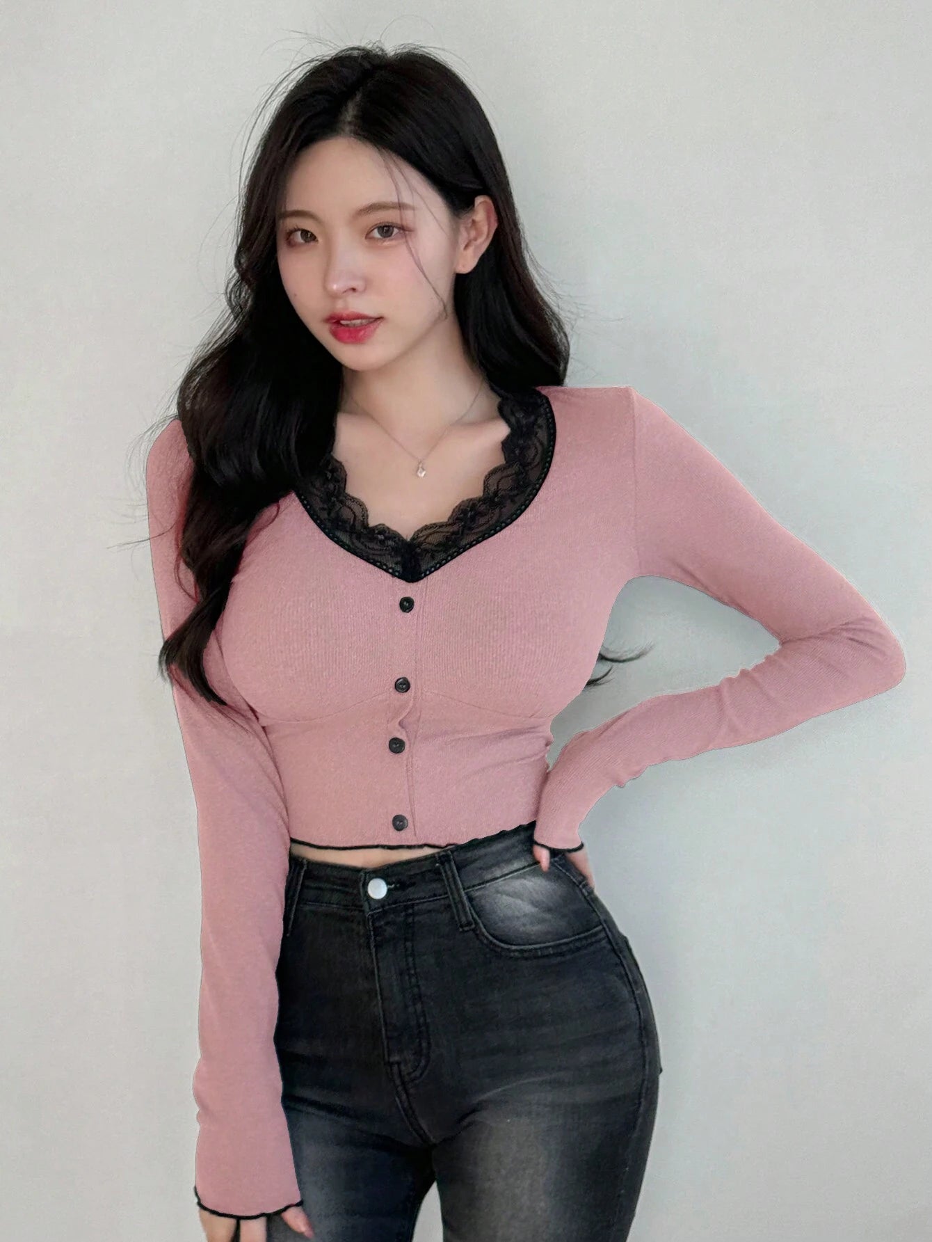 V NECK LACE TRIM LONG SLEEVE BUTTON UP TEE